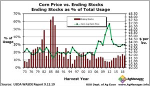 COARSE GRAINS: This month’s 2019/20 U.S. corn outlook is for reduced production, lower corn used for ethanol, and slightly higher ending stocks. Corn production is forecast at 13.799 billion bushels, down 102 million from last month on a lower yield forecast. Corn supplies are down from last month, as a smaller crop more than offsets larger beginning stocks due to lower estimated exports and corn used for ethanol for 2018/19. Corn used for ethanol for 2019/20 is lowered 25 million bushels. With use falling more than supply, corn ending stocks are up 9 million bushels from last month. The season-average corn price received by producers is unchanged at $3.60 per bushel.